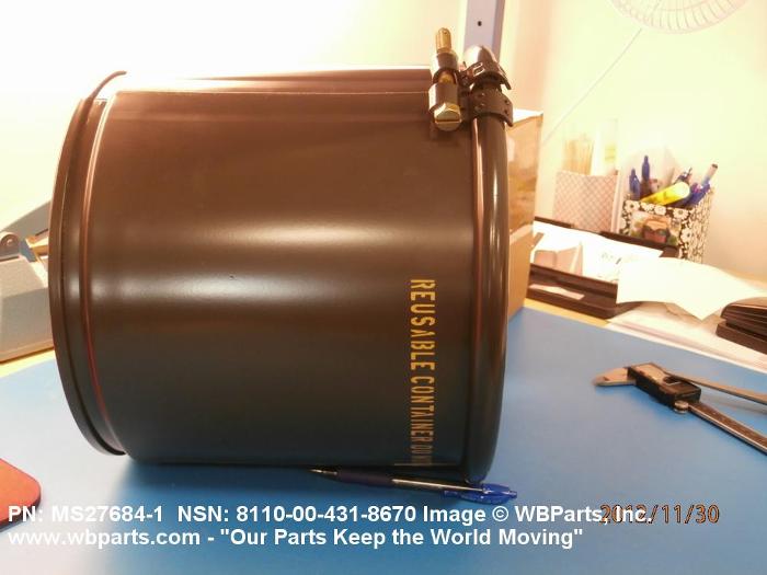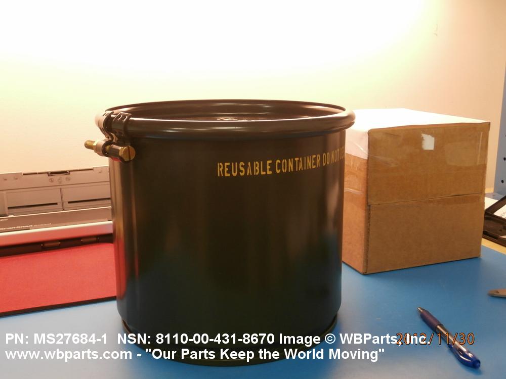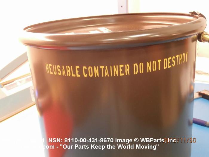 8110-00-431-8670 A straight sided, cylindrically shaped container having flat or bumped ends (heads) which are secured by various methods. One end may serve as a removable cover. It is usually greater in length than breadth and usually has outward, reinforcing rolling hoops. Capacities range from 1/4 gallon to 110 gallons (0.9 liters to 416.35 liters) or the equivalent in pounds (kilograms). It is designed for dry materials, liquids, or semiliquids. For items having integral fastening and/or shock absorbing devices and designed for shipping and storage of specific items, see SHIPPING AND STORAGE CONTAINER (as modified). See also BOX (as modified). Excludes BARREL, METAL; CAN, ICE CREAM, METAL; and TANK, LIQUID STORAGE, METAL.
