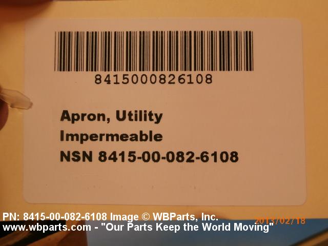 8415-00-082-6108 A multipurpose apron made of suitable materials to provide general protection to the wearers clothing when engaged in the performance of miscellaneous duties. It may have pockets.