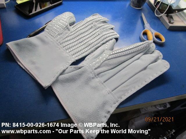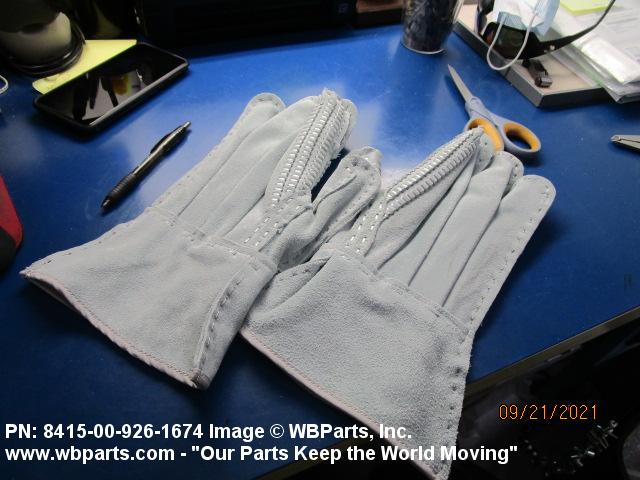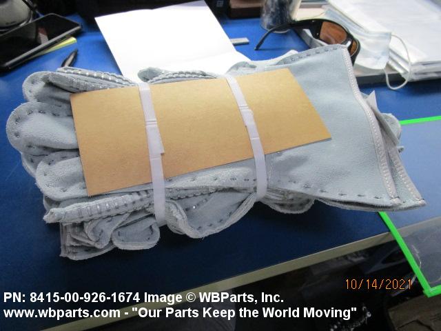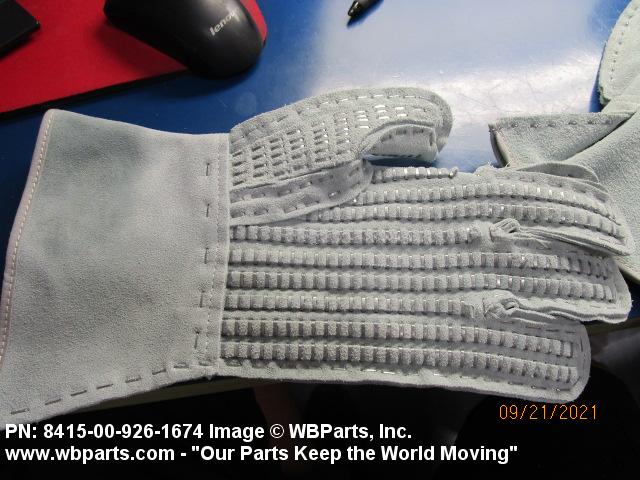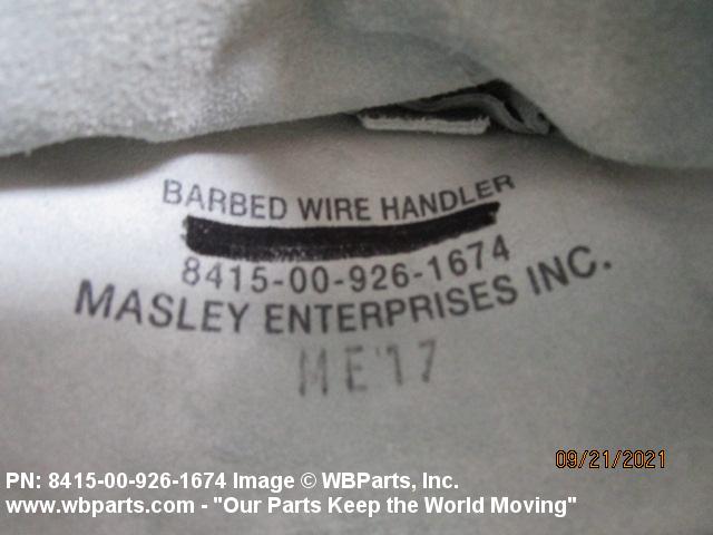 8415-00-926-1674 Gloves having the entire palm, including the fronts of the fingers and thumb, reinforced with leather strips and metal staples and stitching. They are designed specifically to protect the hands of personnel working with barbed tape and wire.