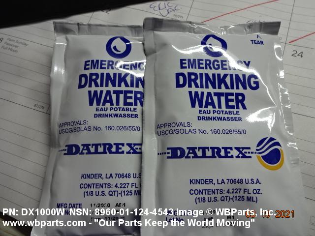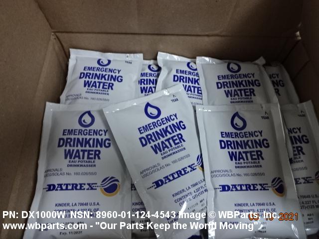 8960-01-124-4543 Sterile drinking water flexibly packaged for emergency use as part of Ejection Seat Survival Kits, Individual Hot Weather Survival Kits, Individual Overwater Survival Kits, in life rafts or in shelters. Excludes WATER, DRINKING, STERILE.