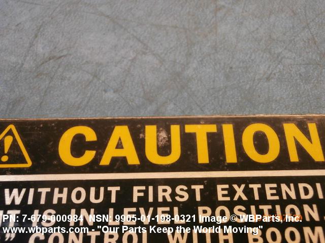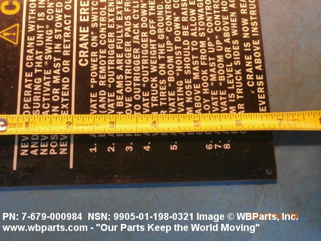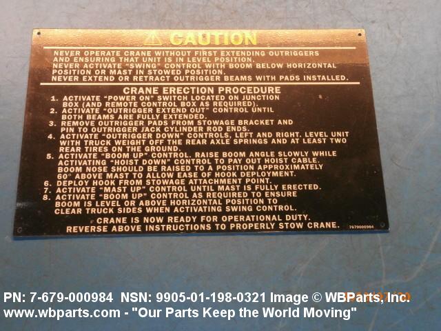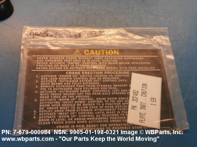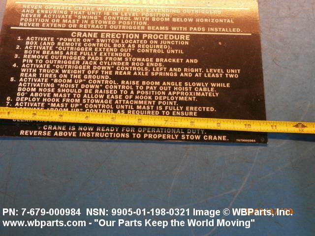 9905-01-198-0321 An item which is rigid or semirigid, generally flat and smooth. Its thickness is small in comparison to its length and width. It has data thereon indicating method of operation, maintenance, and/or personnel protection. See also MARKER, IDENTIFICATION; PLATE, IDENTIFICATION; PLATE, DESIGNATION; PLATE SET, INSTRUCTION; DECAL; and LABEL. For items having the combination function of a PLATE, INSTRUCTION and PLATE, IDENTIFICATION, see PLATE, IDENTIFICATION. Excludes TAG, INSTRUCTION.